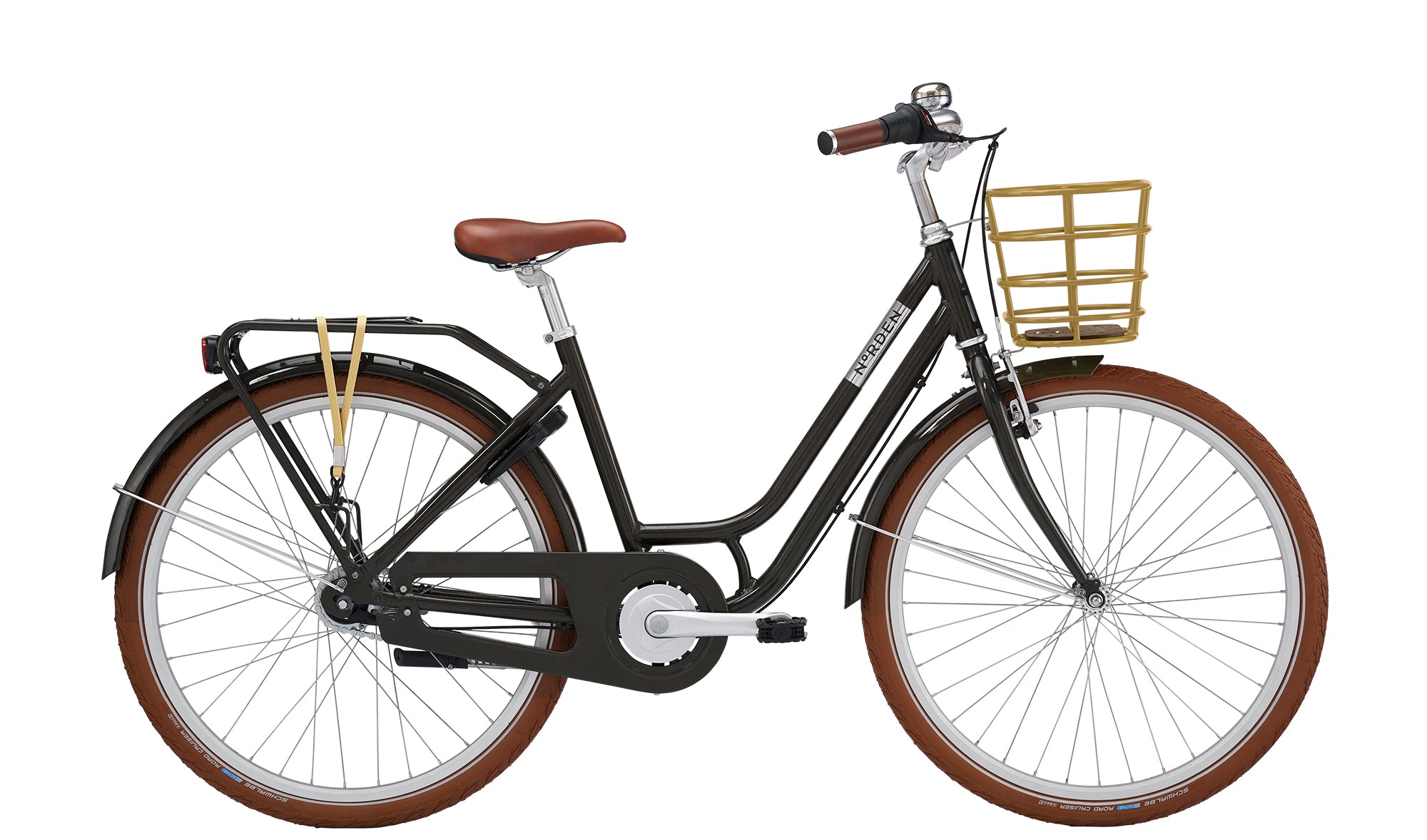 Det lette aluminiumsstel, den bløde komfortsadel og de eksklusive NORDEN håndtag giver en behagelig og stilfuld køreoplevelse. Cyklen har indfarvet kædeskærm, praktisk cykelkurv og bagagebærer med strop, der gør den klar til hverdagen fra dag ét.