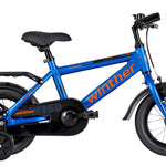 Super flot blå 12" Børnecykel til drenge. Udstyret med bagagebærer, skærme og støttehjul.